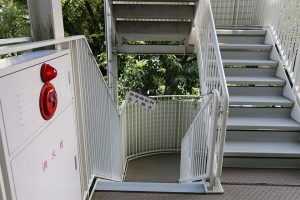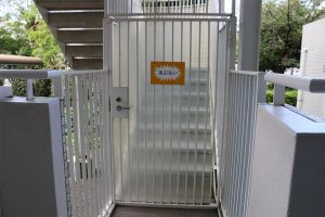 上の写真の2階-1階間が10月1日から15日の間、通行できるようになります。この階段の1階にある扉は管理棟側階段の扉のように、閉めたあと自動的に施錠されるようにはなっていません。ここはオートロックの外なので、使用後は必ずお部屋のキーで閉めるようにしてください。また、外からお戻りの際は内側のロックを必ずかけてください。