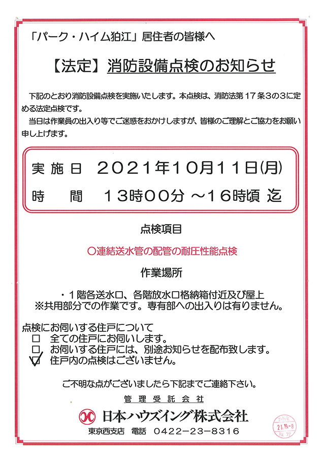 カテゴリー お知らせ 共用部消防設備点検のお知らせ 投稿者 作成者: phk_rijikai 投稿日 2021年10月8日 10月11日午後に共用部の消防設備点検を行います。今回の点検は連結送水管の耐圧試験で、皆さまのお部屋に入って点検するものではありません。詳細は下記掲示物をご覧ください。 タグ 点検 ← 【1号棟】夜間の配達や来訪者対応について:エレベーター更新 → 1工区工事進捗状況:エレベーター更新
