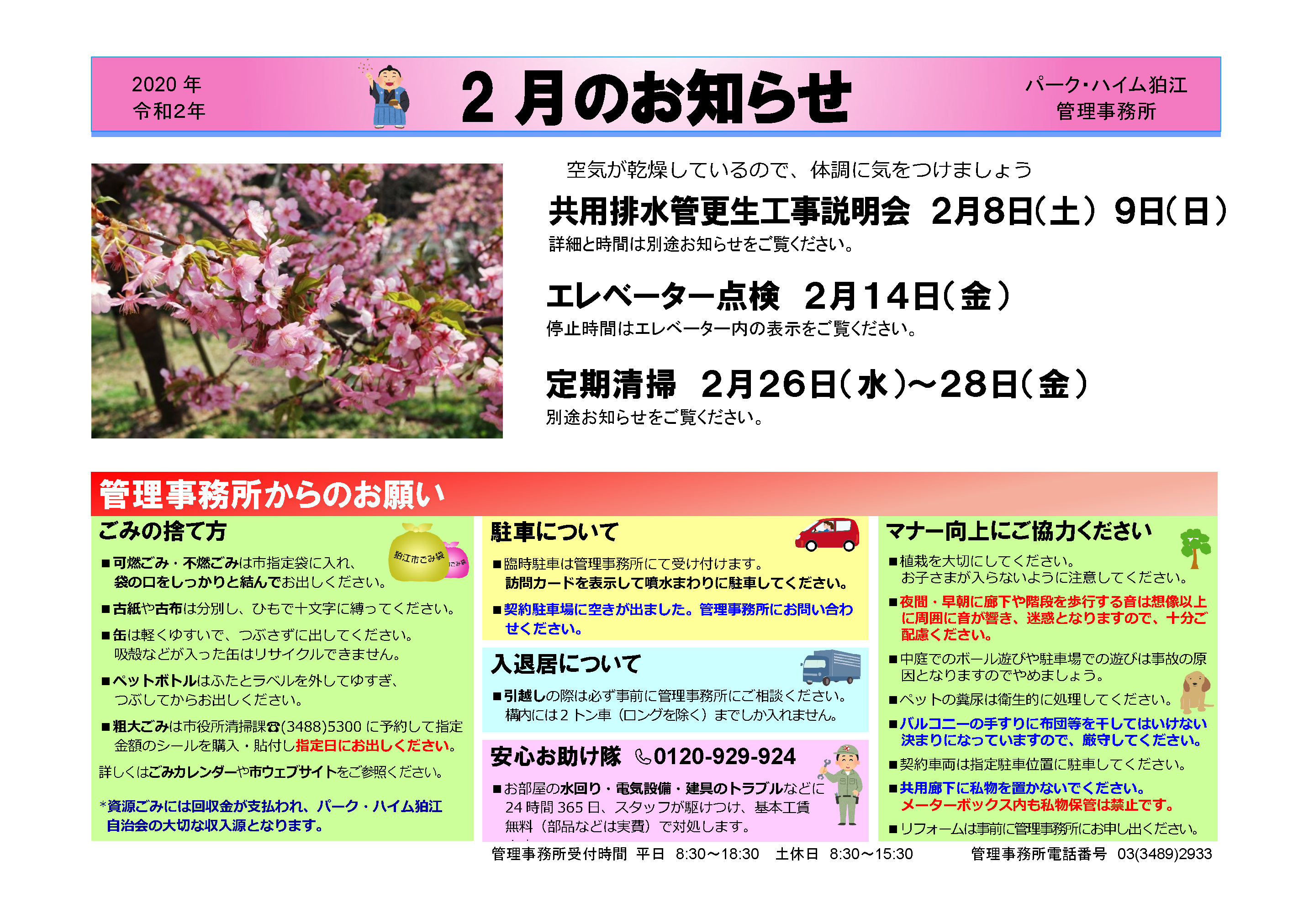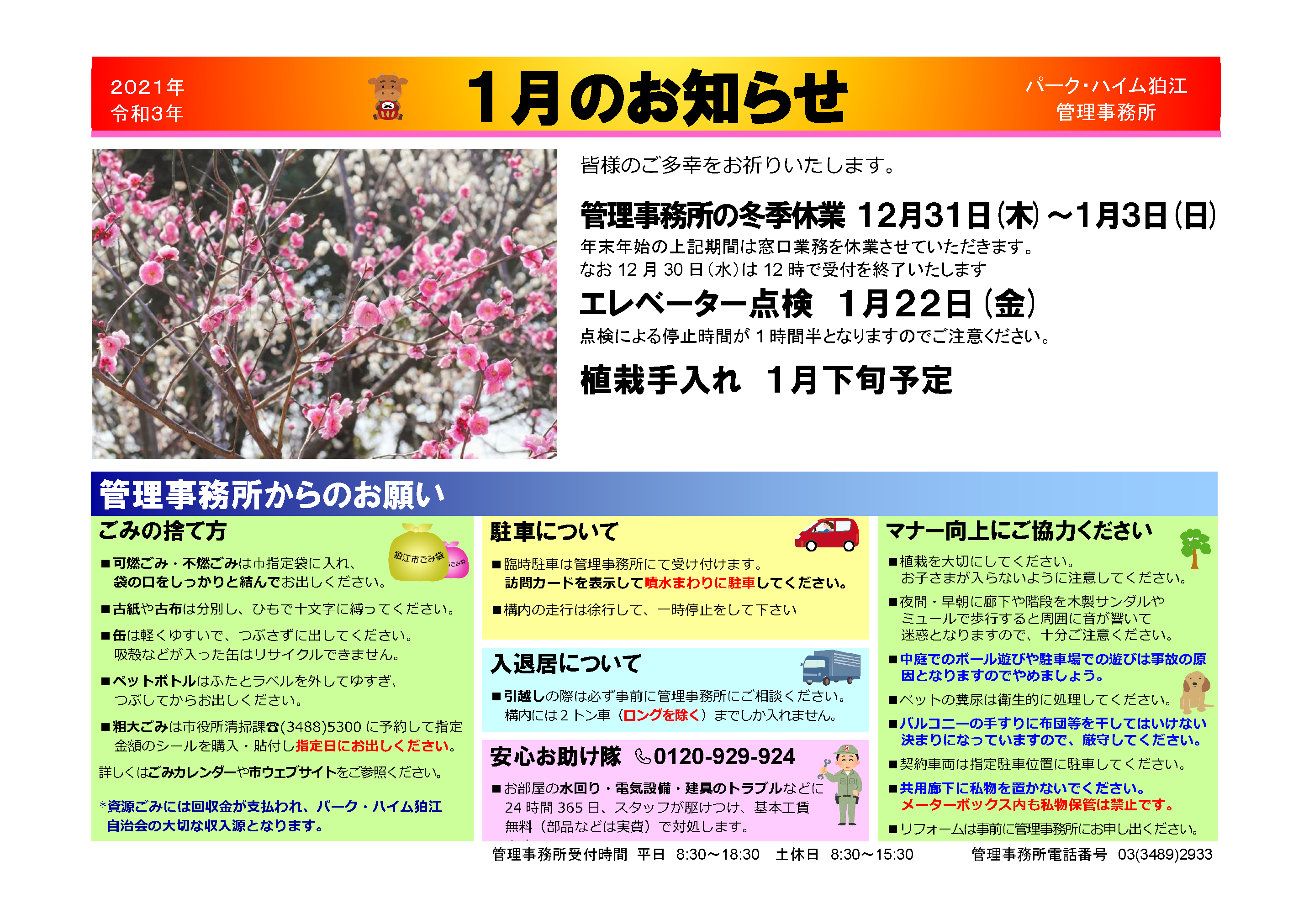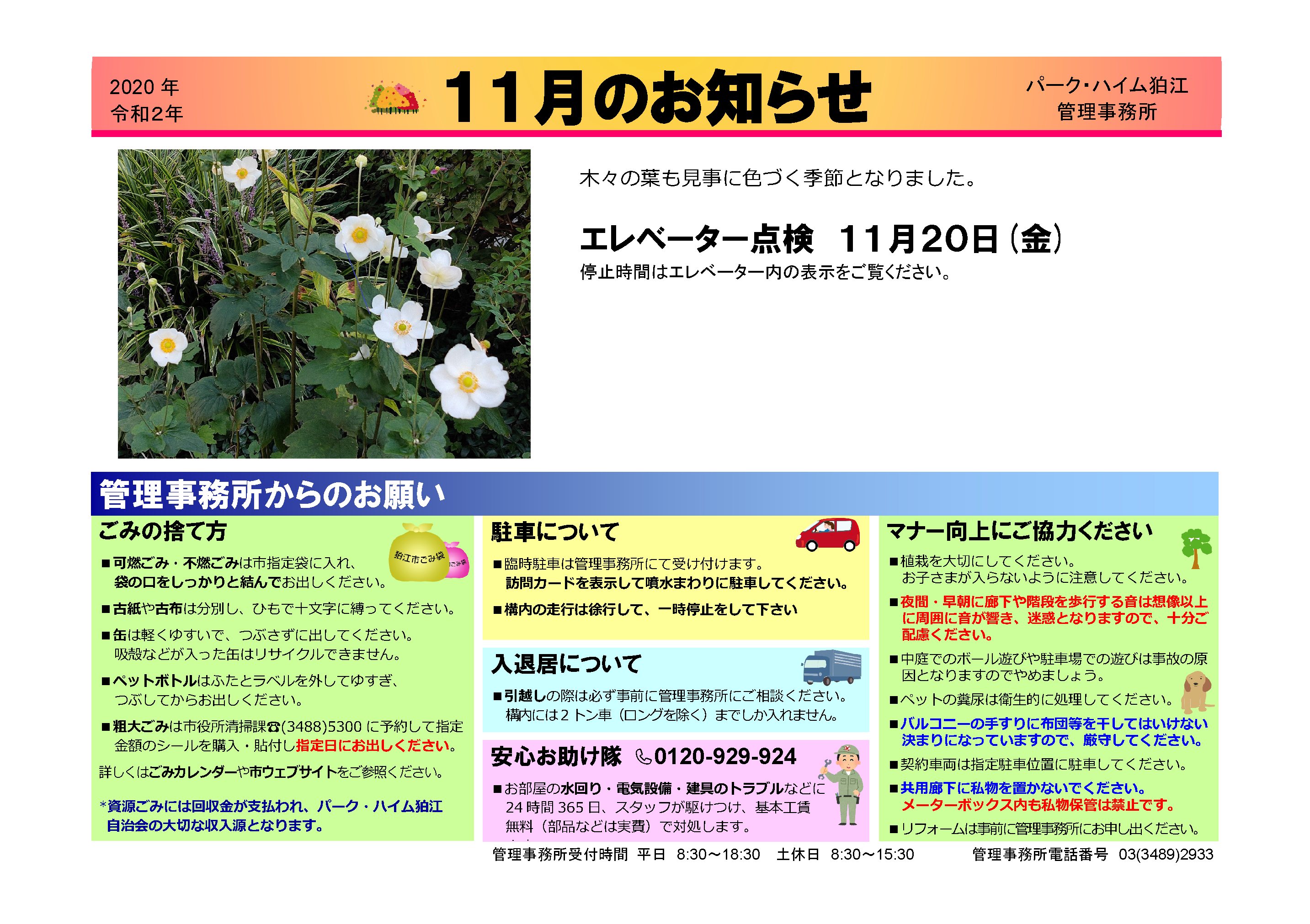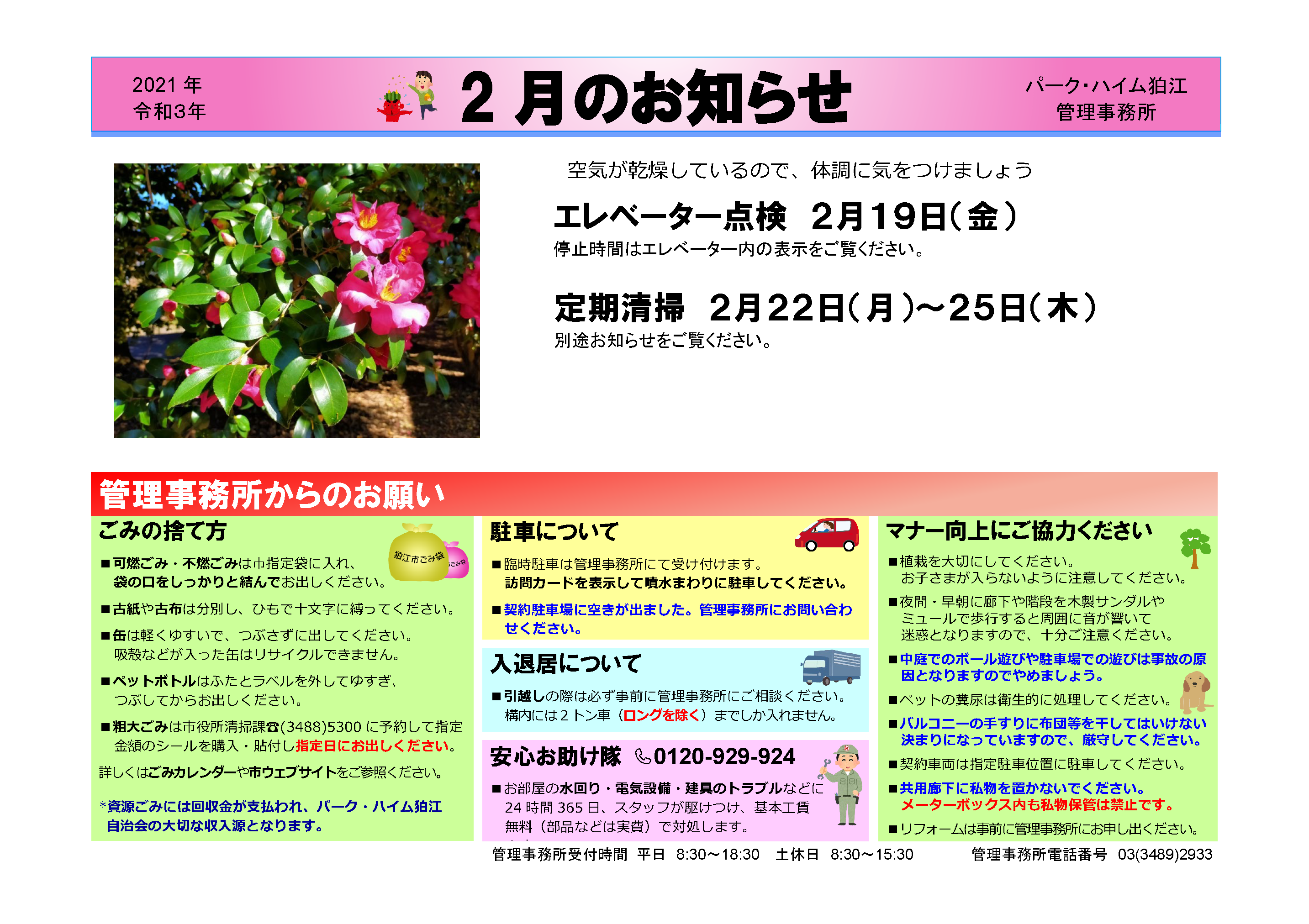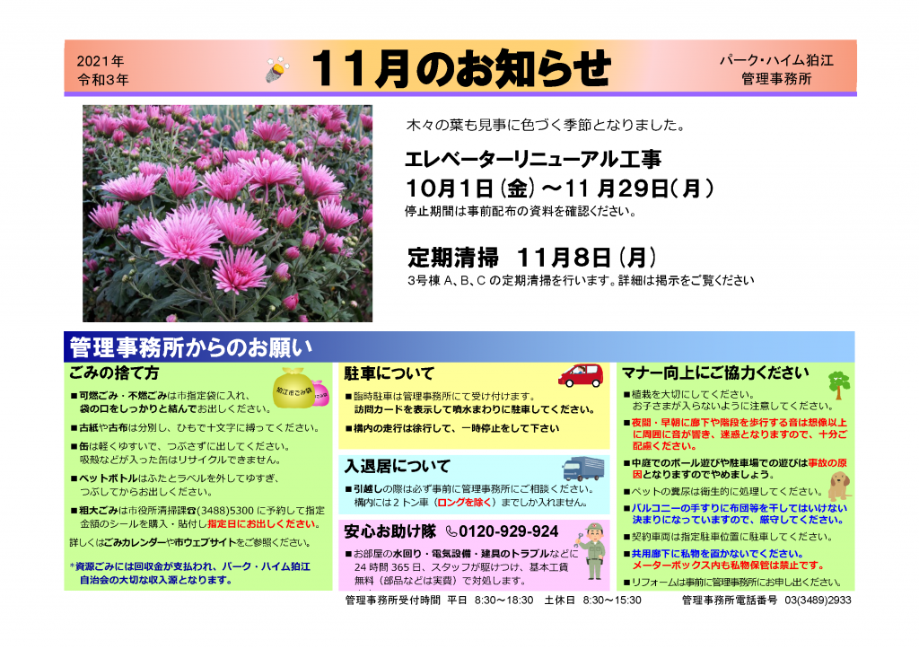 今月の管理事務所お知らせ 管理事務所お知らせ バックナンバー 2021年11月2021年10月2021年9月2021年8月2021年7月2021年6月2021年5月2021年4月2021年3月2021年2月2021年1月2020年12月2020年11月2020年10月2020年9月2020年8月2020年7月2020年6月2020年5月2020年4月2020年3月2020年2月2020年1月2019年12月