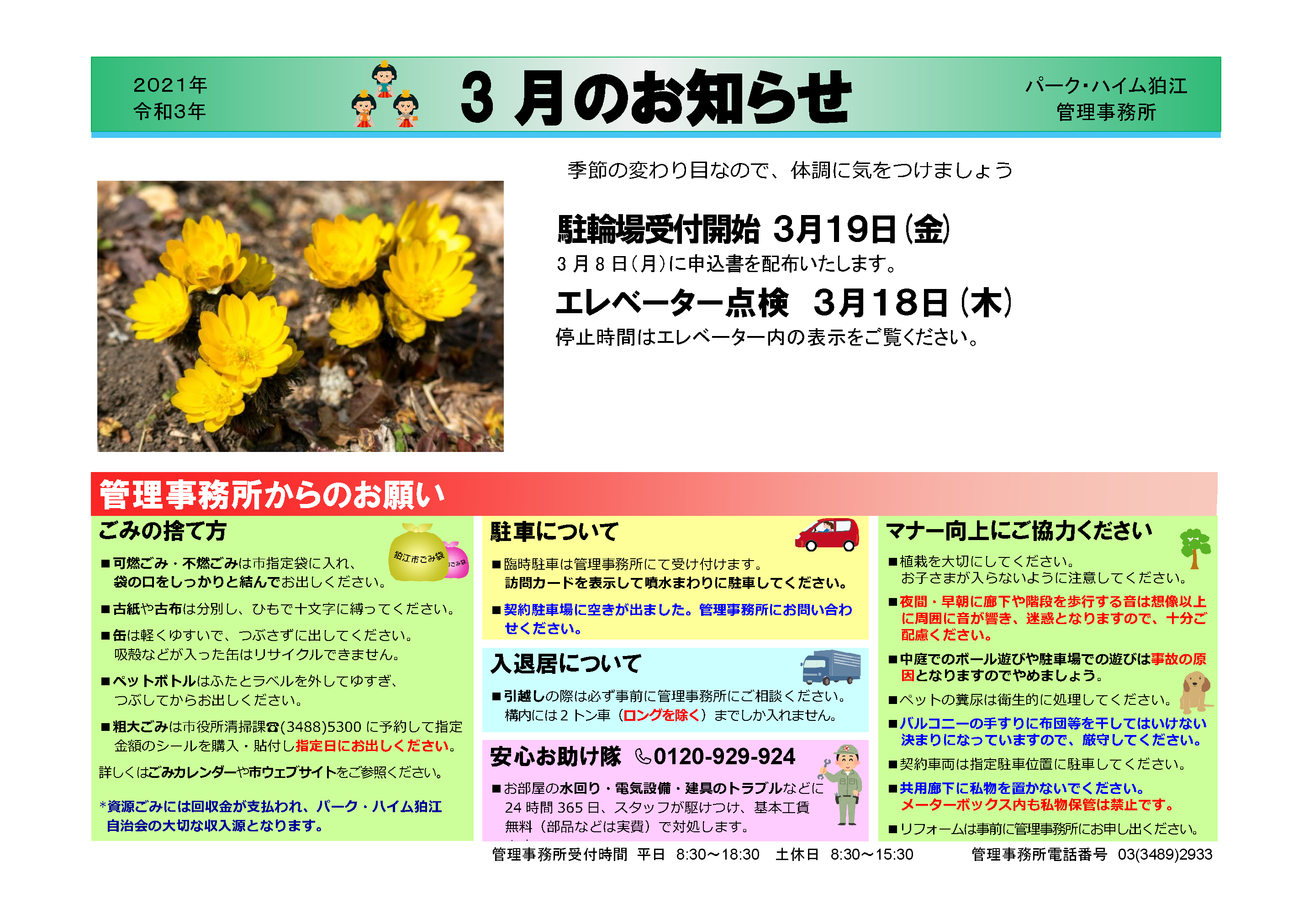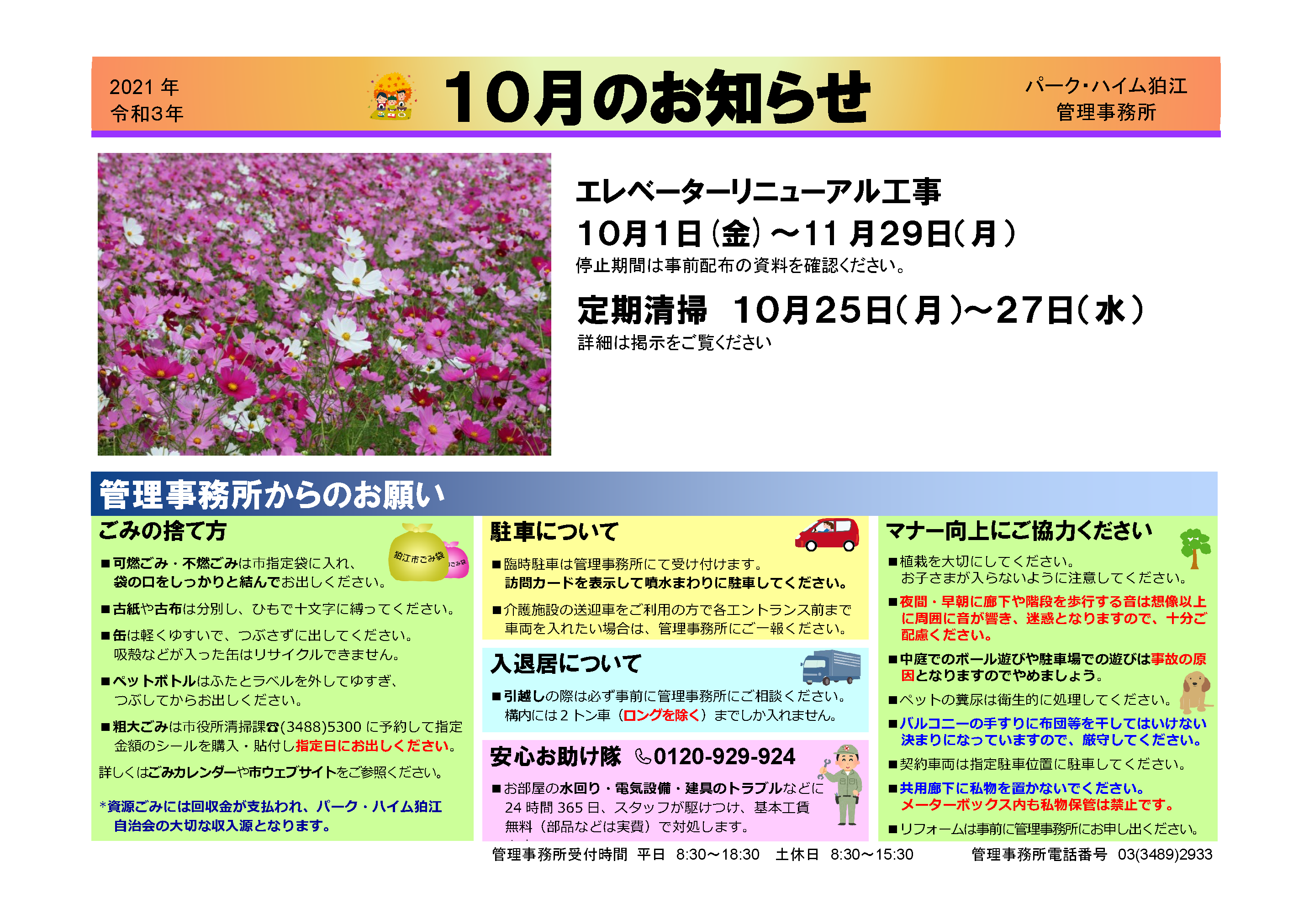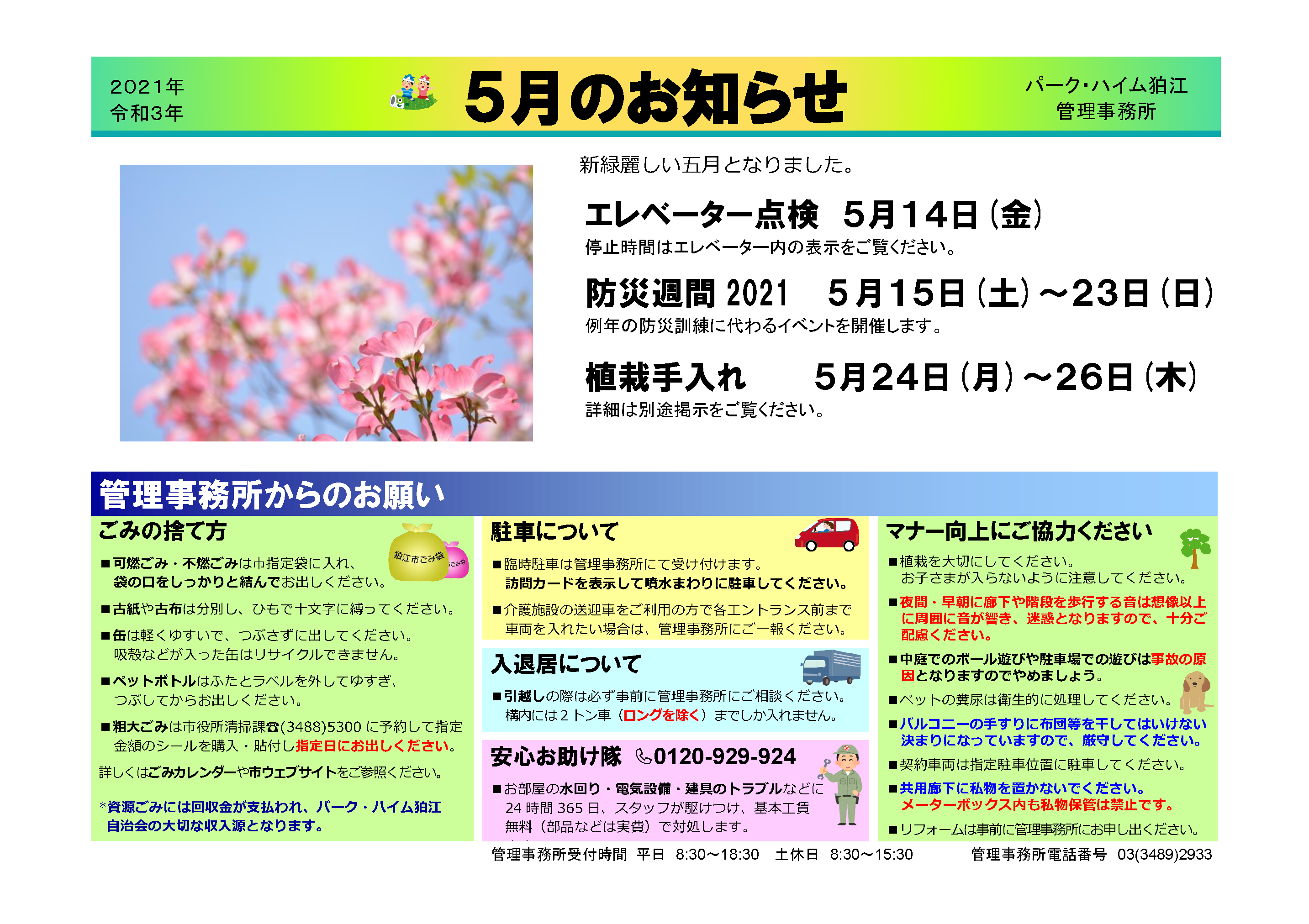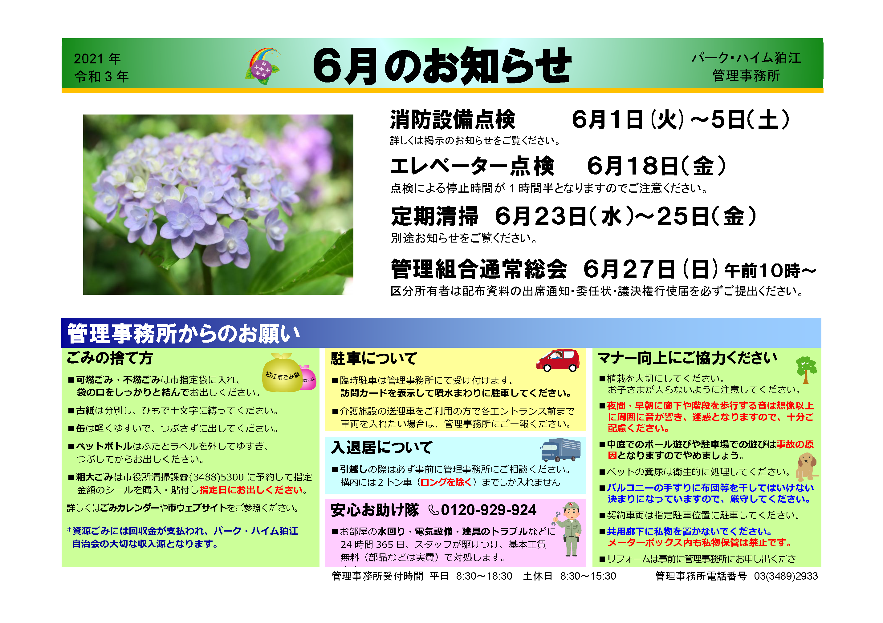 今月の管理事務所お知らせ 管理事務所お知らせ バックナンバー 2021年11月2021年10月2021年9月2021年8月2021年7月2021年6月2021年5月2021年4月2021年3月2021年2月2021年1月2020年12月2020年11月2020年10月2020年9月2020年8月2020年7月2020年6月2020年5月2020年4月2020年3月2020年2月2020年1月2019年12月