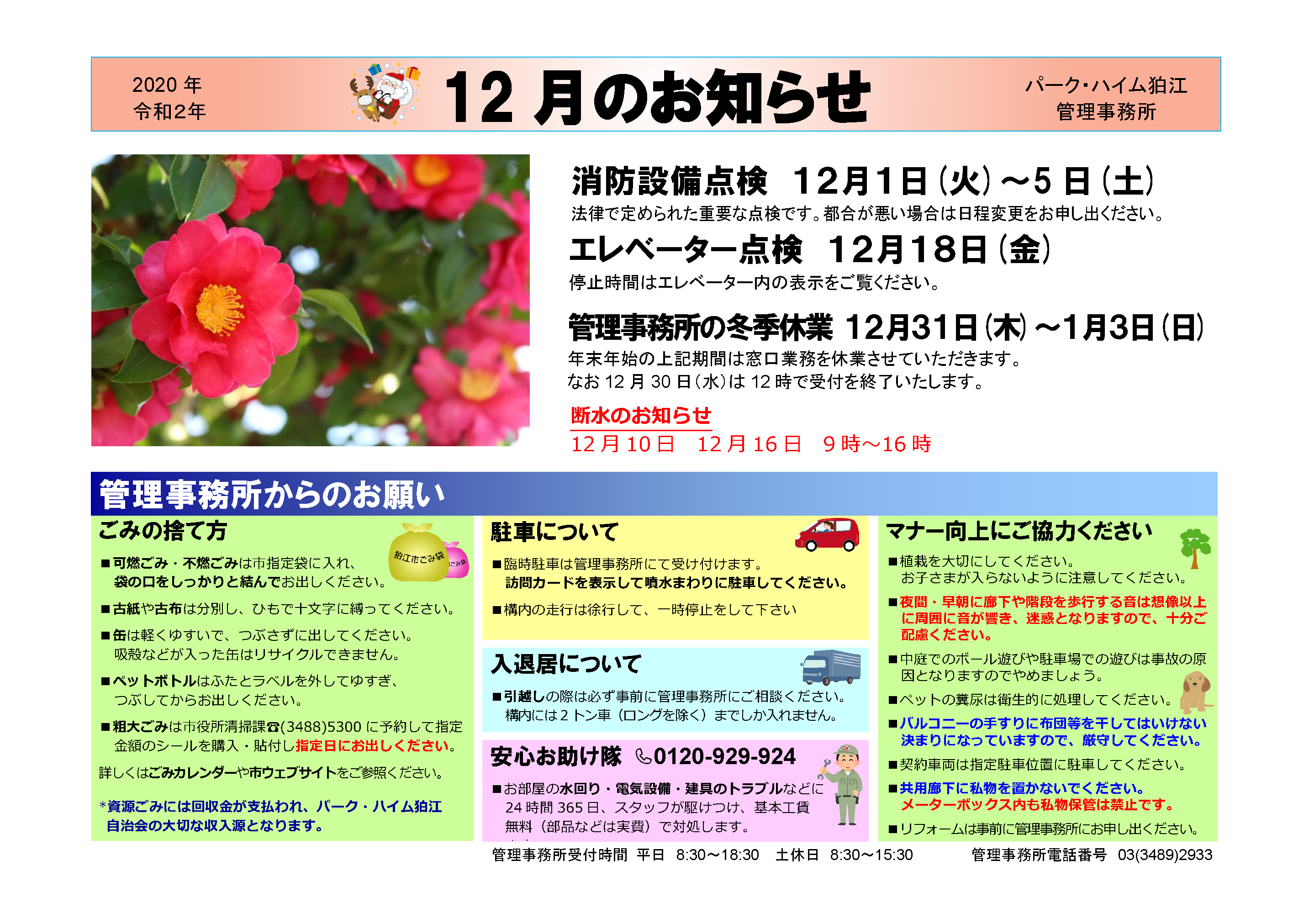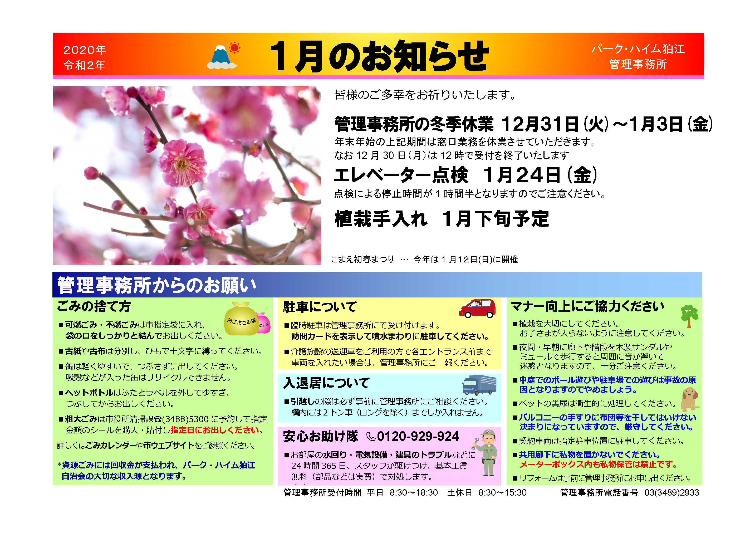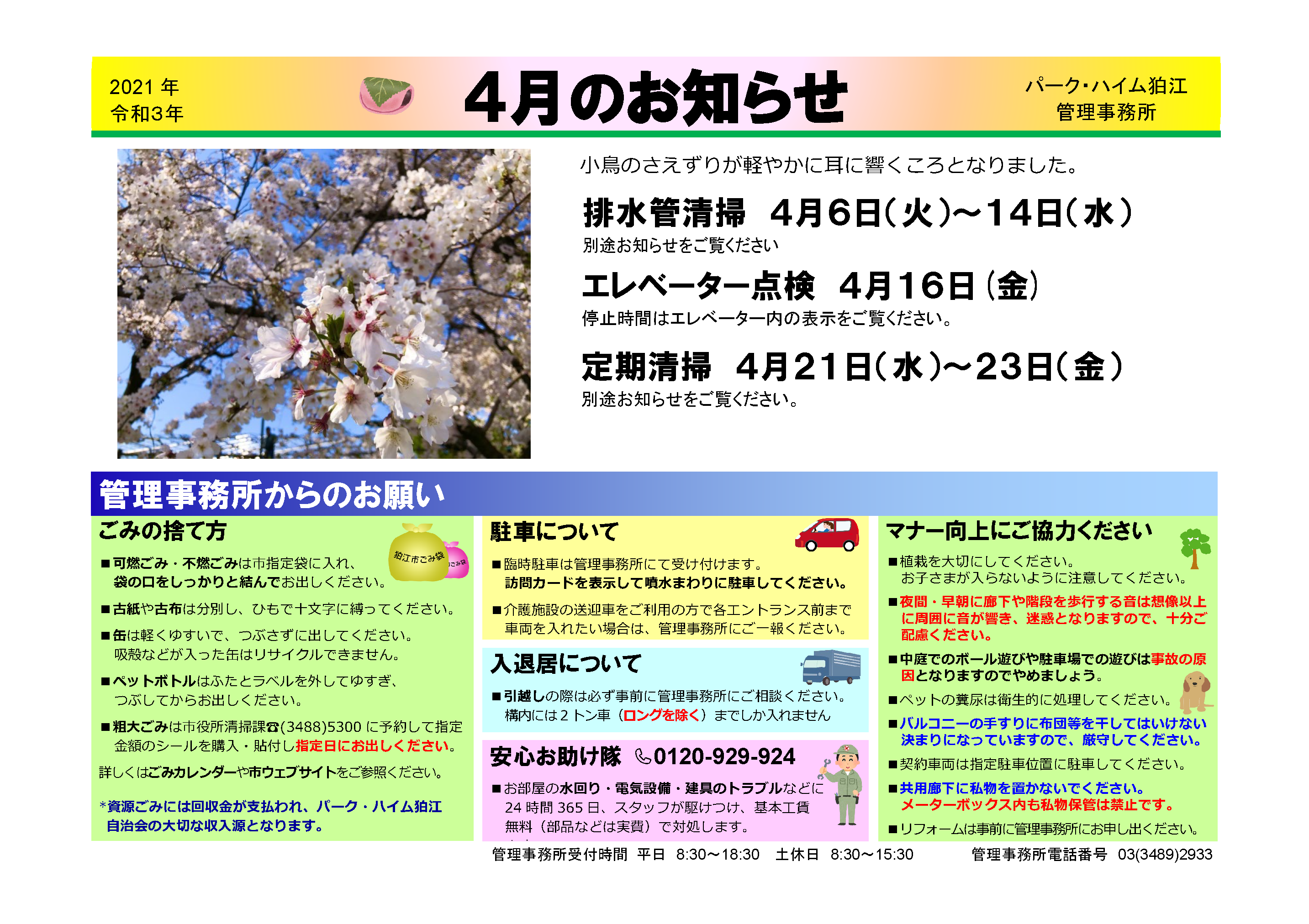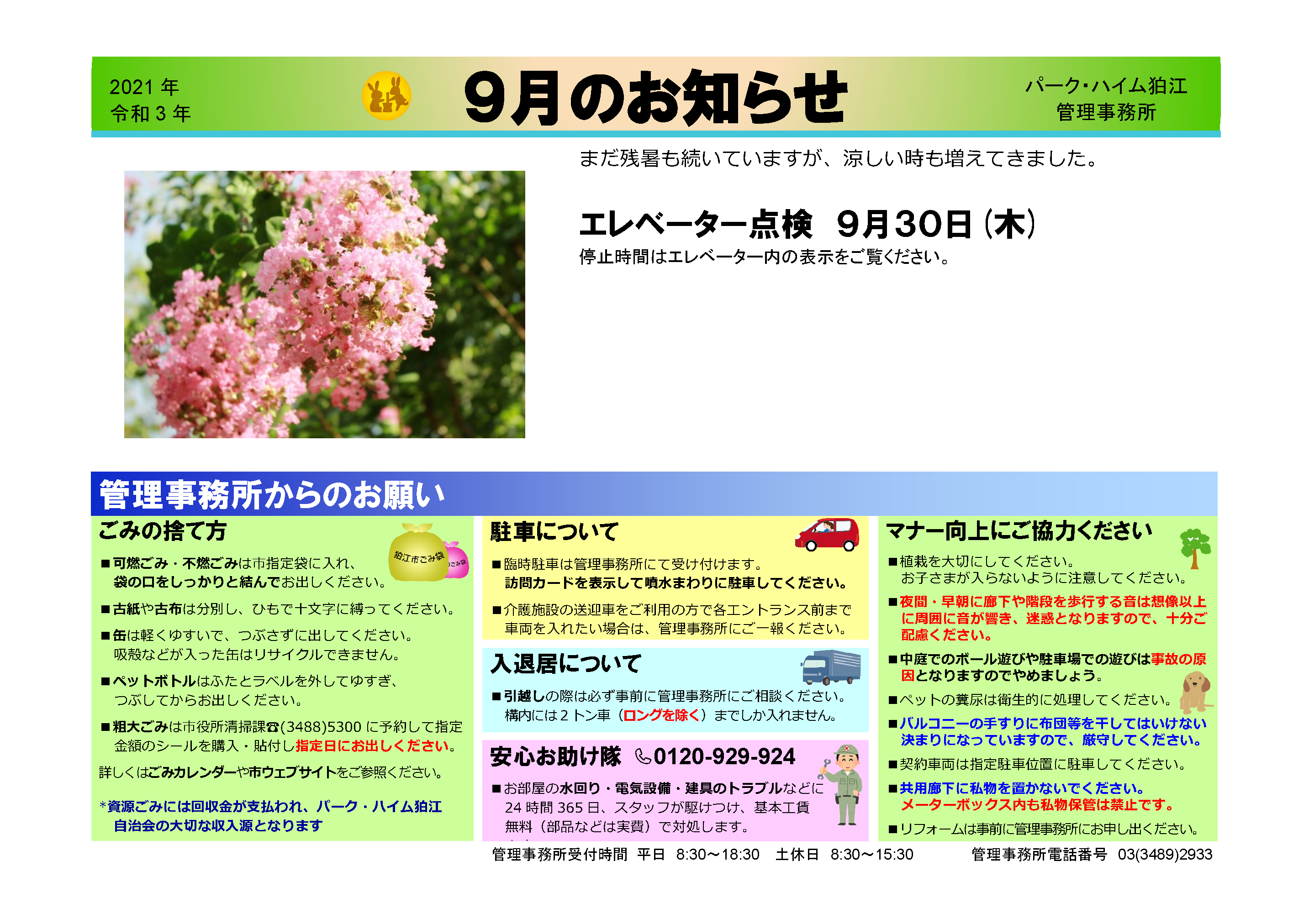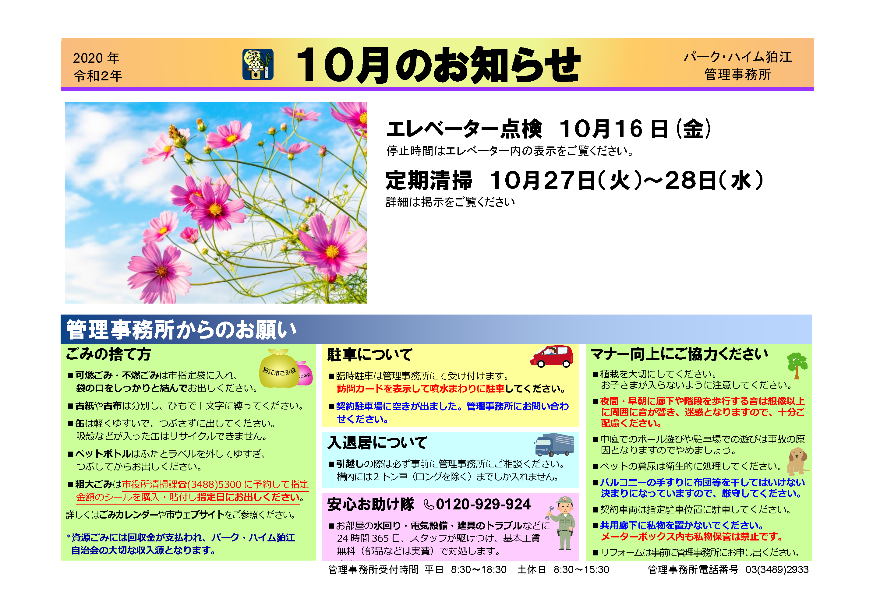 今月の管理事務所お知らせ 管理事務所お知らせ バックナンバー 2021年11月2021年10月2021年9月2021年8月2021年7月2021年6月2021年5月2021年4月2021年3月2021年2月2021年1月2020年12月2020年11月2020年10月2020年9月2020年8月2020年7月2020年6月2020年5月2020年4月2020年3月2020年2月2020年1月2019年12月