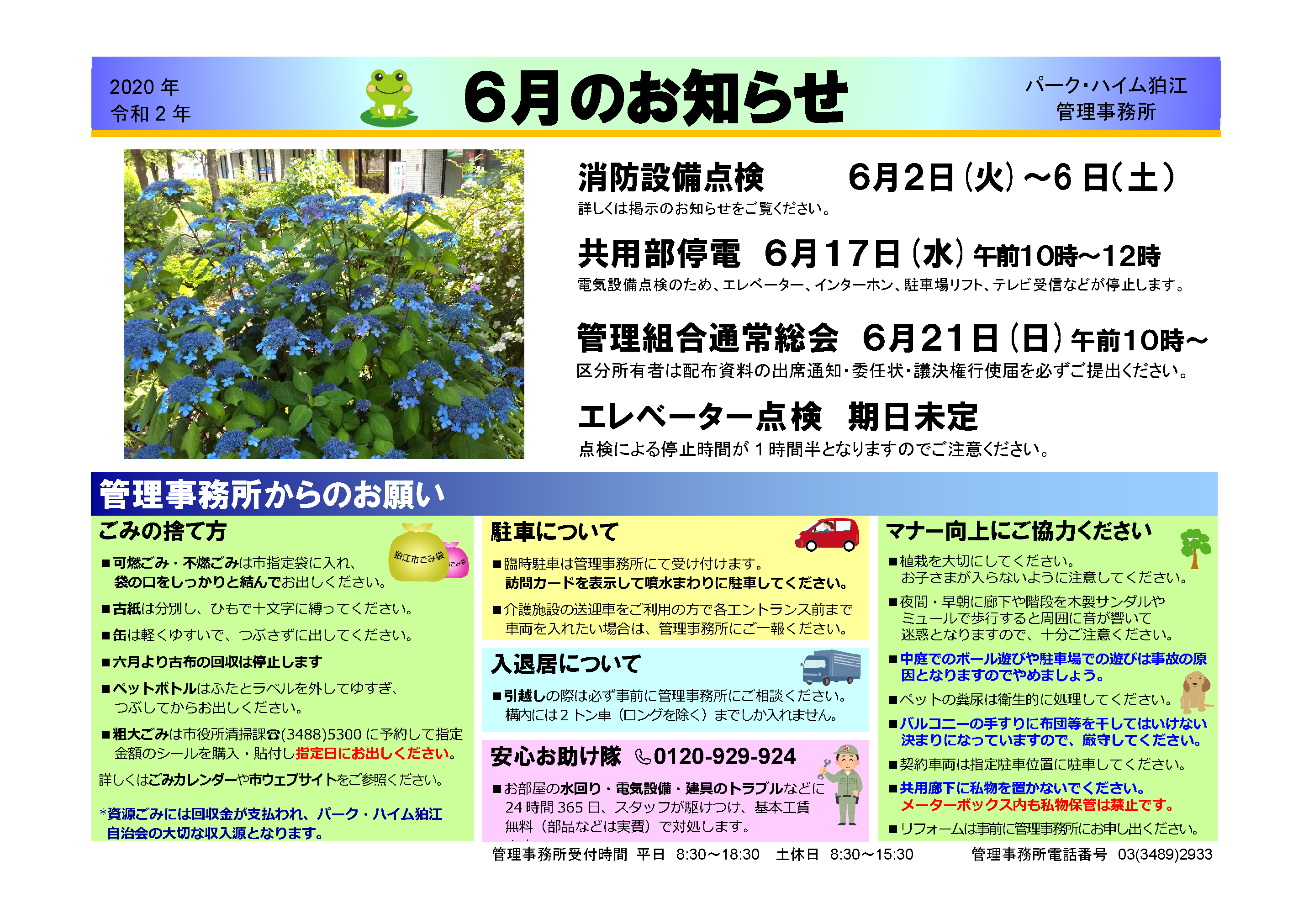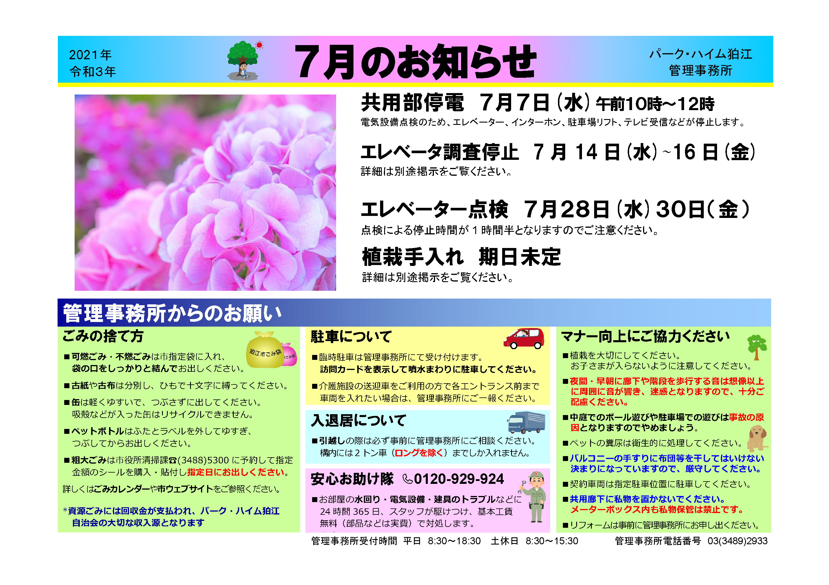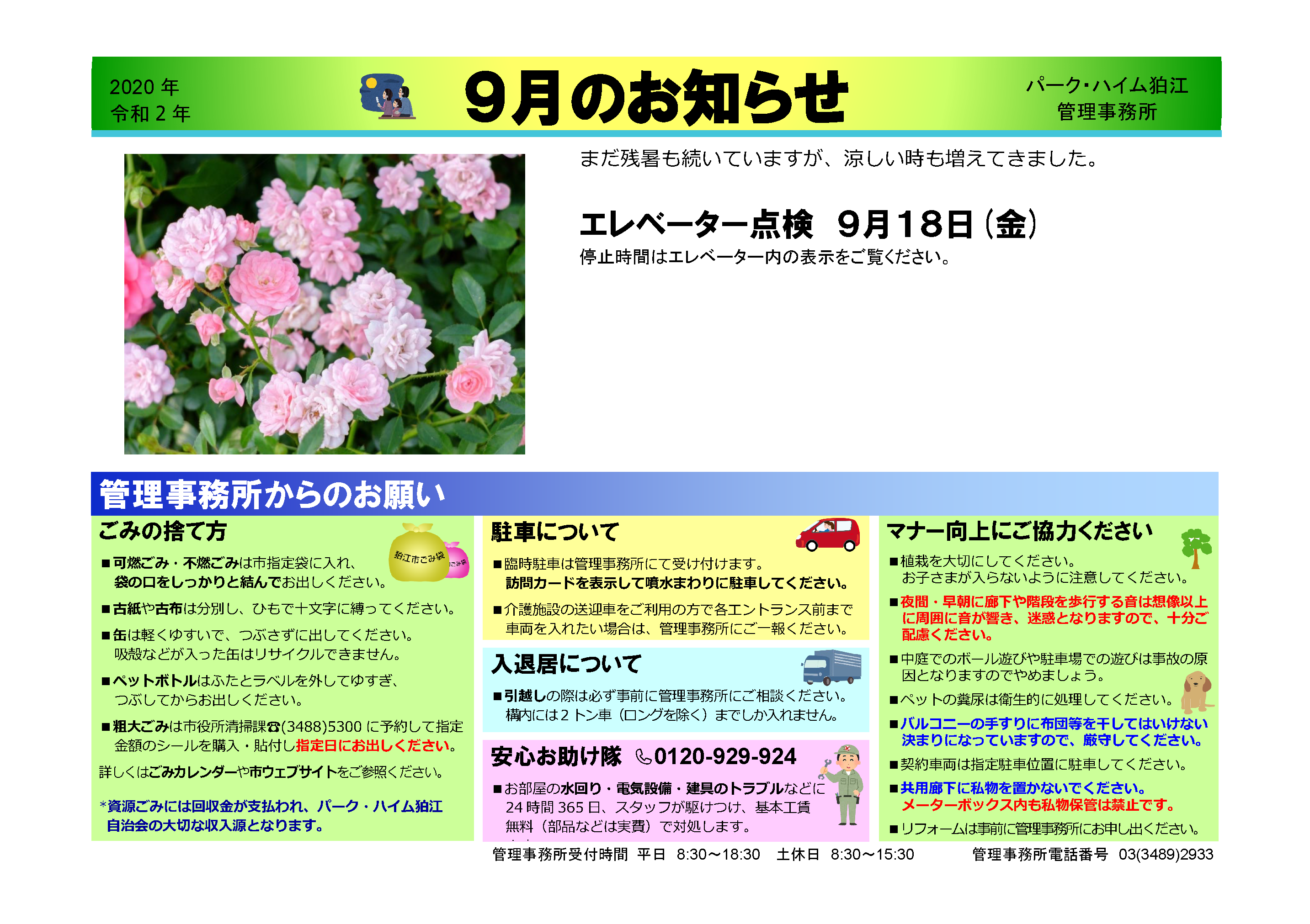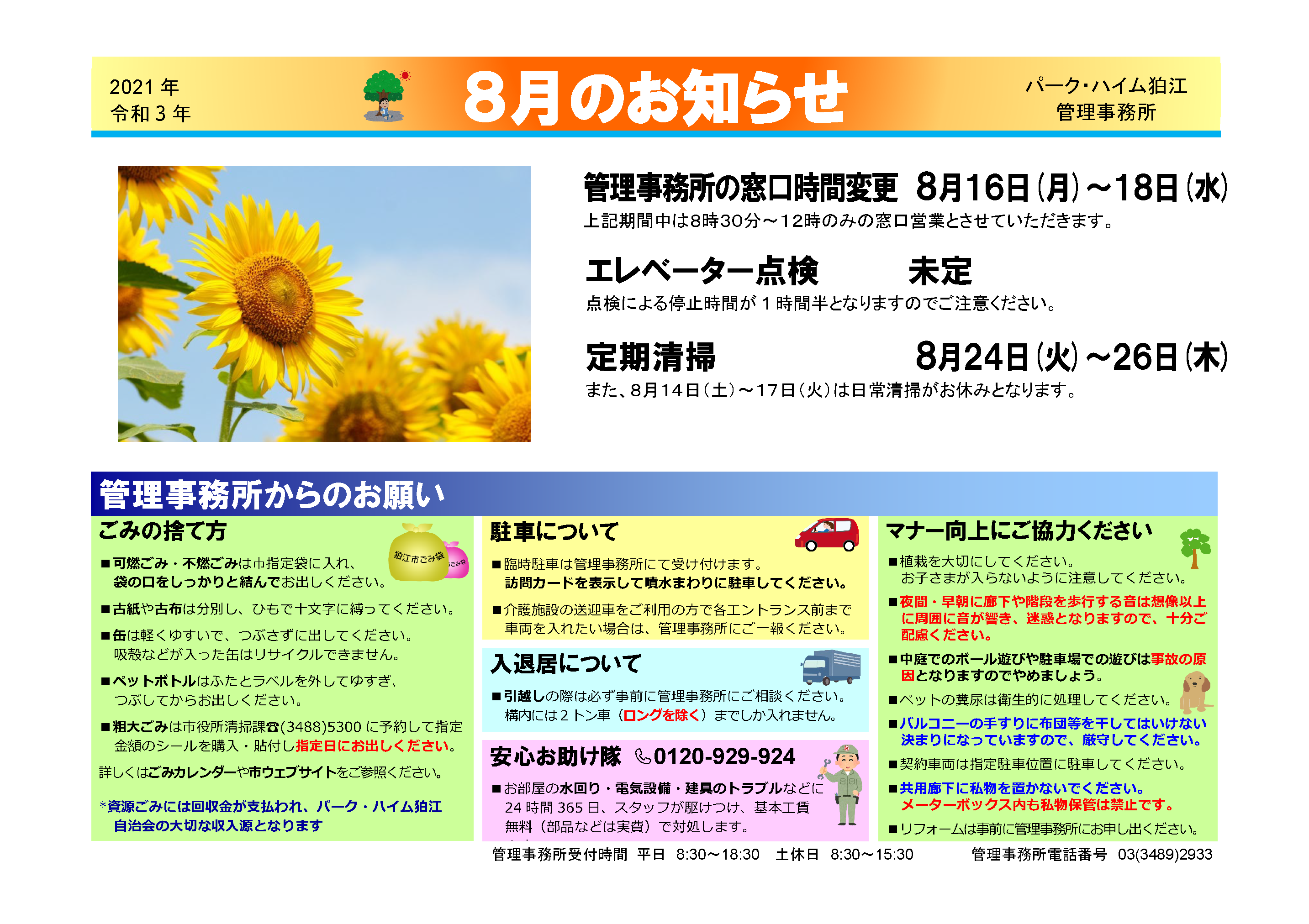 今月の管理事務所お知らせ 管理事務所お知らせ バックナンバー 2021年11月2021年10月2021年9月2021年8月2021年7月2021年6月2021年5月2021年4月2021年3月2021年2月2021年1月2020年12月2020年11月2020年10月2020年9月2020年8月2020年7月2020年6月2020年5月2020年4月2020年3月2020年2月2020年1月2019年12月