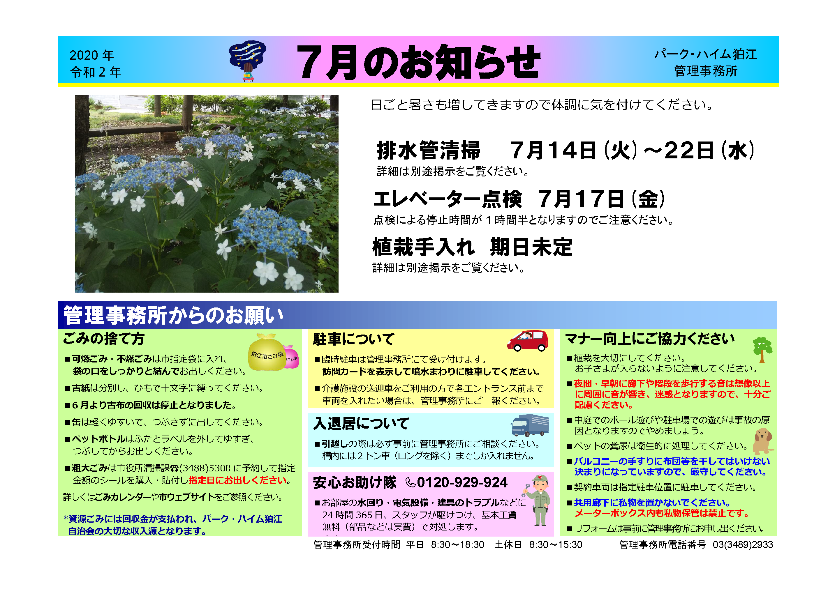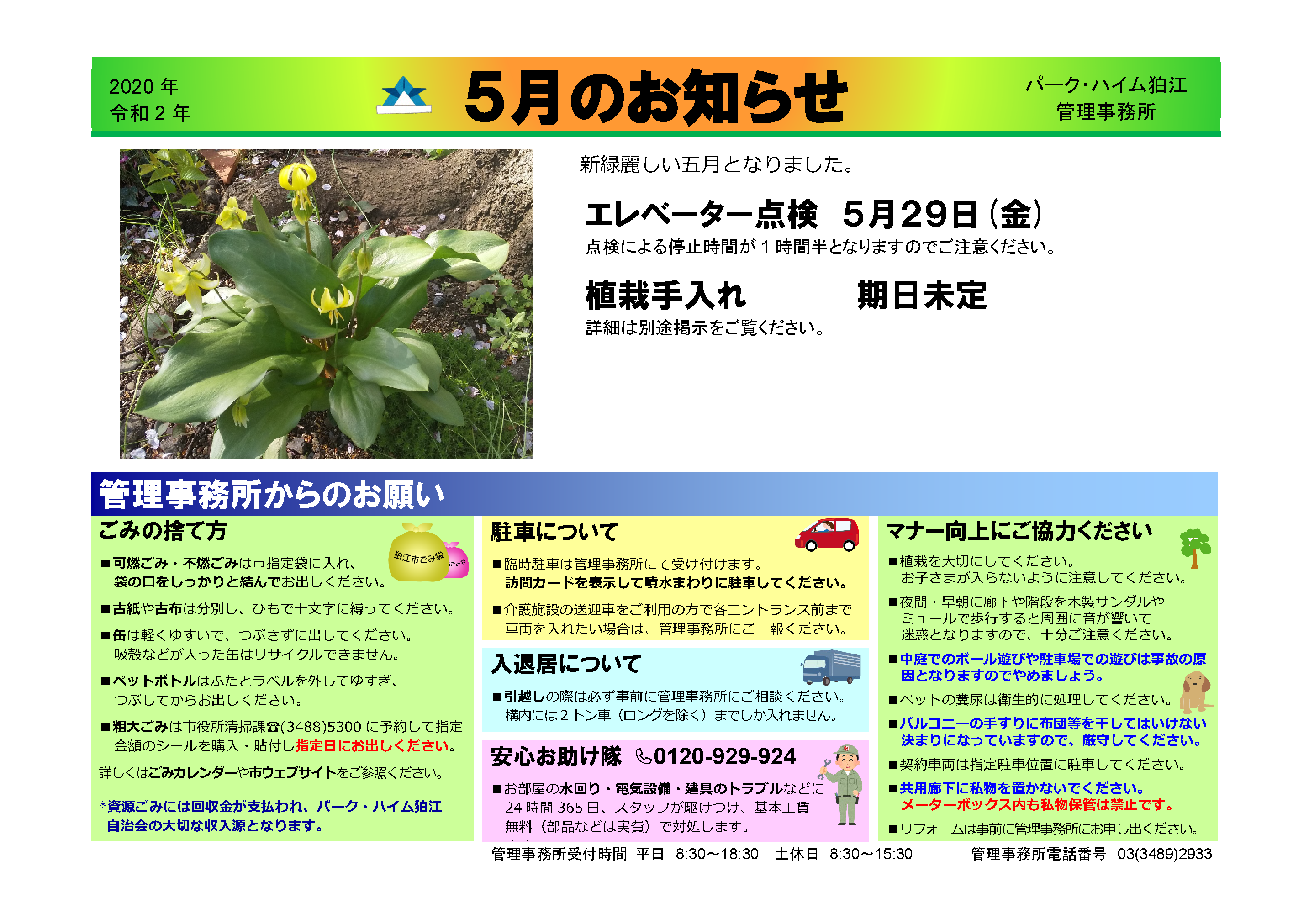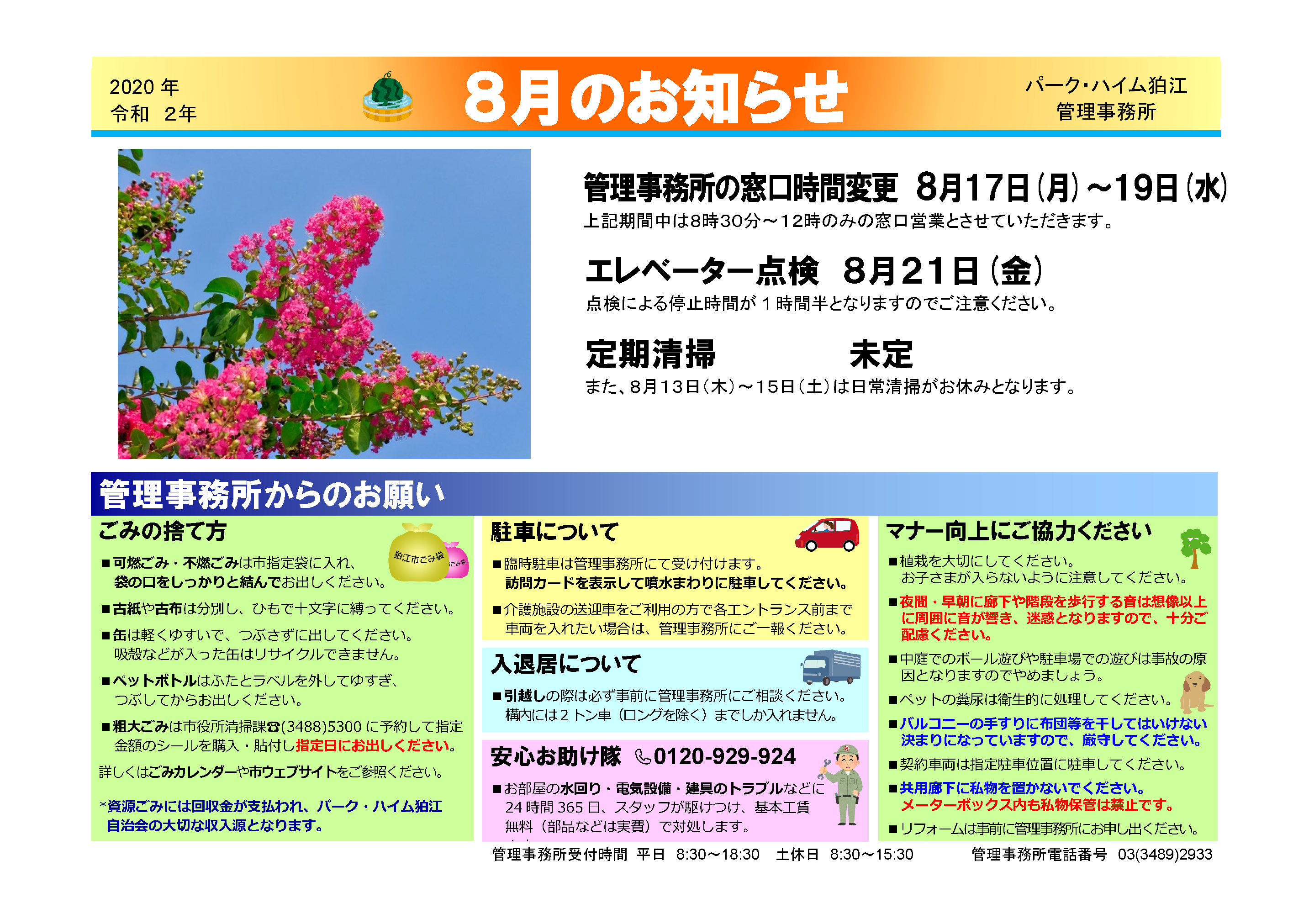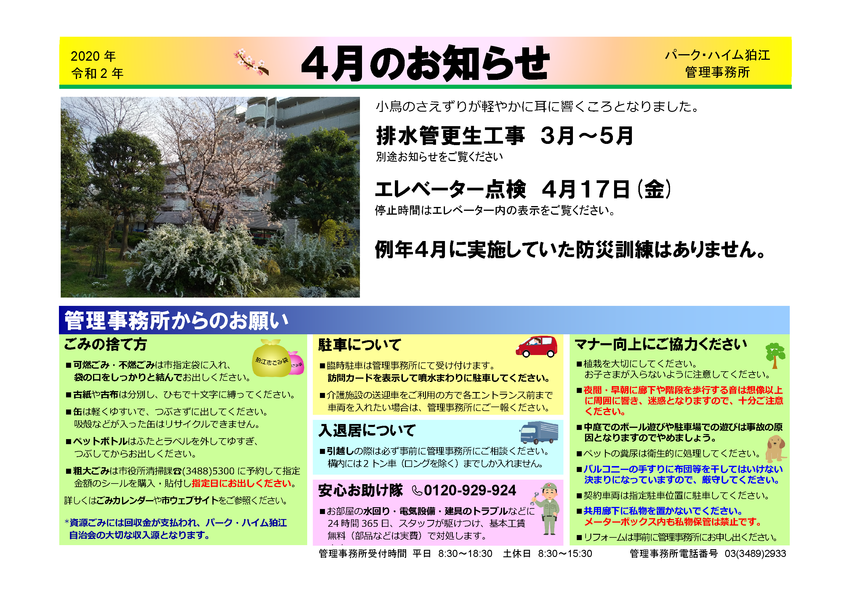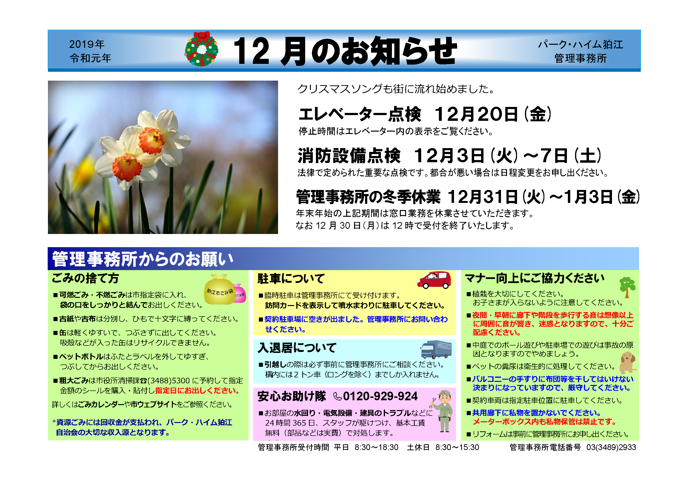 今月の管理事務所お知らせ 管理事務所お知らせ バックナンバー 2021年11月2021年10月2021年9月2021年8月2021年7月2021年6月2021年5月2021年4月2021年3月2021年2月2021年1月2020年12月2020年11月2020年10月2020年9月2020年8月2020年7月2020年6月2020年5月2020年4月2020年3月2020年2月2020年1月2019年12月